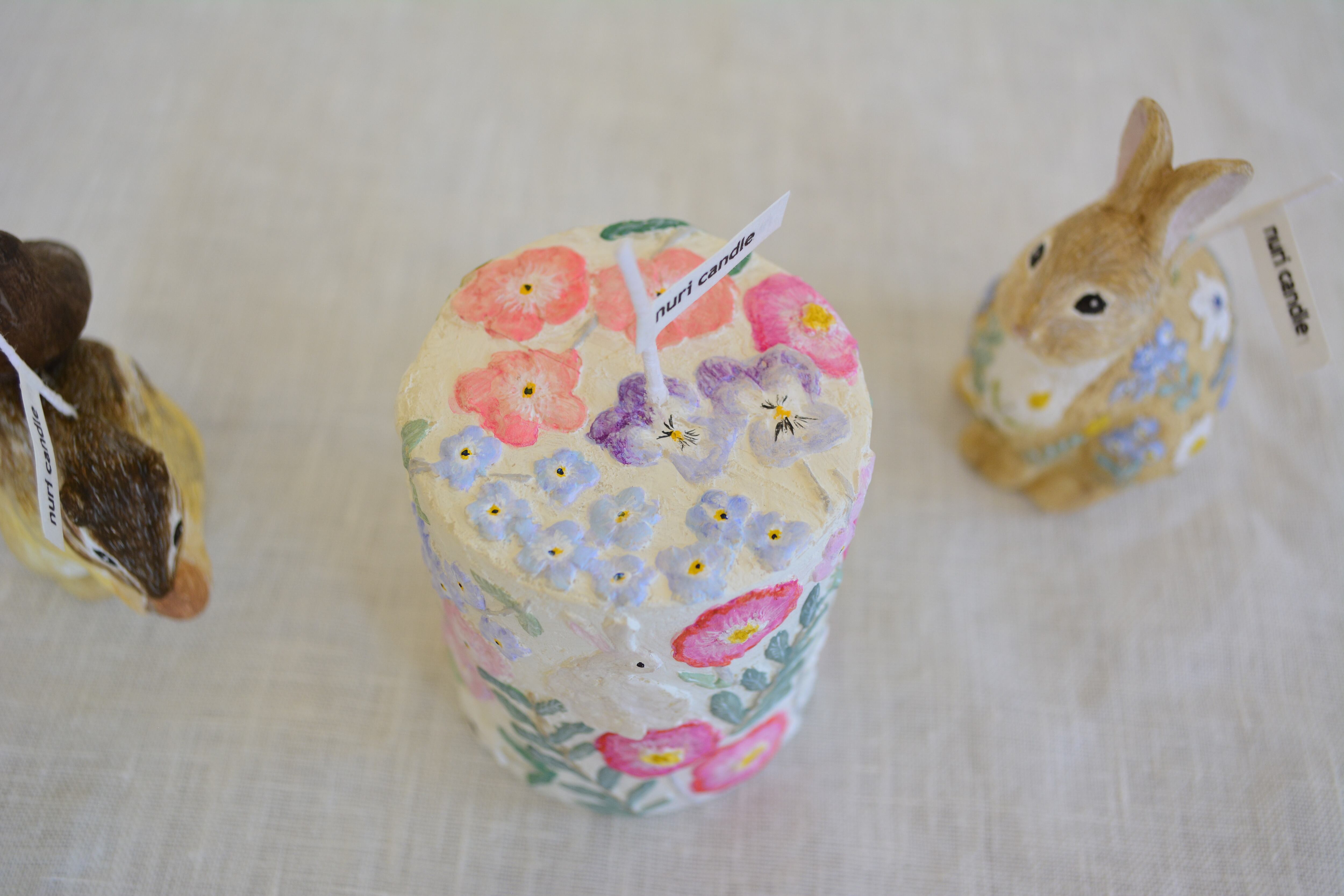 ・ロウが垂れる場合がありますので、陶器などの燃えないお皿の上に倒れないようにしっかりと固定して灯してください。
